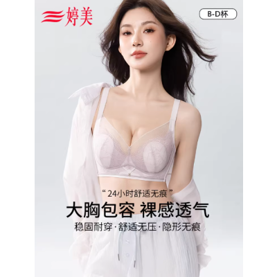 婷美轻薄蕾丝大胸显小内衣防垂调整型收副乳全包裹无钢圈大码文胸
