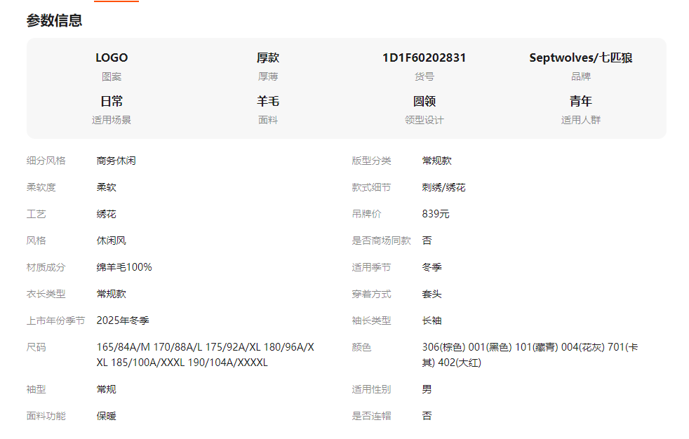 【加厚纯羊毛】七匹狼圆领毛衣男2025冬季新款通勤重磅内搭针织衫