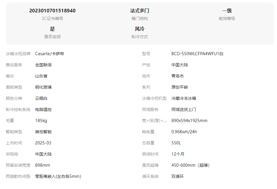 Casarte/卡萨帝 BCD-550WLCFPA4WFU1白 冰箱